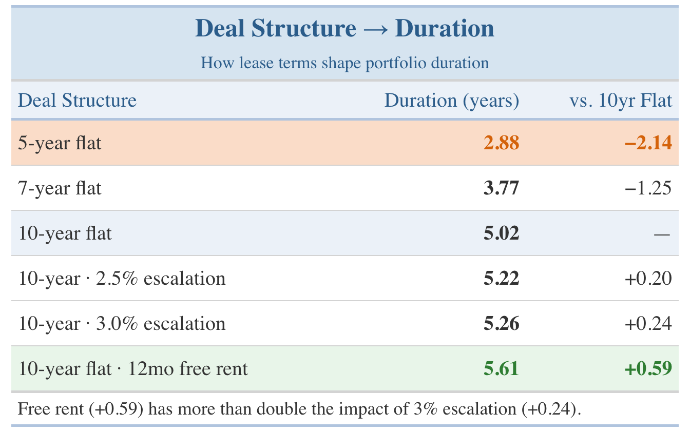 A few things jump out. Term length is the dominant lever. The spread between a 5-year and a 10-year deal is 2.14 years of duration. But free rent is surprisingly potent: 12 months of free rent on a 10-year flat deal pushes duration from 5.02 to 5.61, an increase of 0.59 years, more than double the effect of 3% annual escalation. Why? Because free rent eliminates the earliest cash flows, the ones that carry the most present-value weight and pull the balance point forward. Remove them, and the center of gravity shifts later. Escalation, by contrast, only nudges the later payments slightly higher.