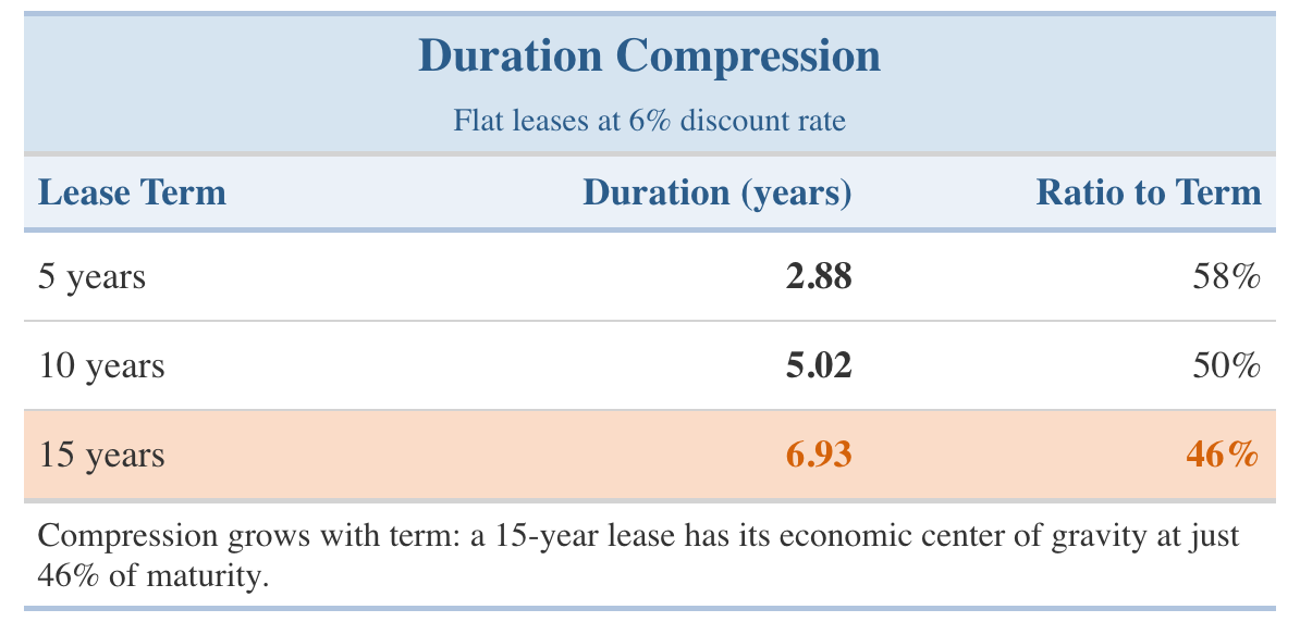 Duration is always shorter than the remaining lease term, because earlier payments are worth more in present-value terms (they’re discounted less). And the degree of that compression depends on how long the lease is.