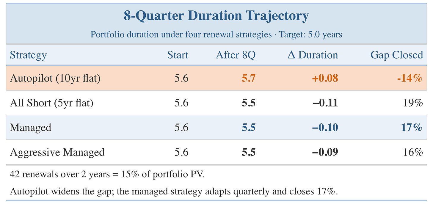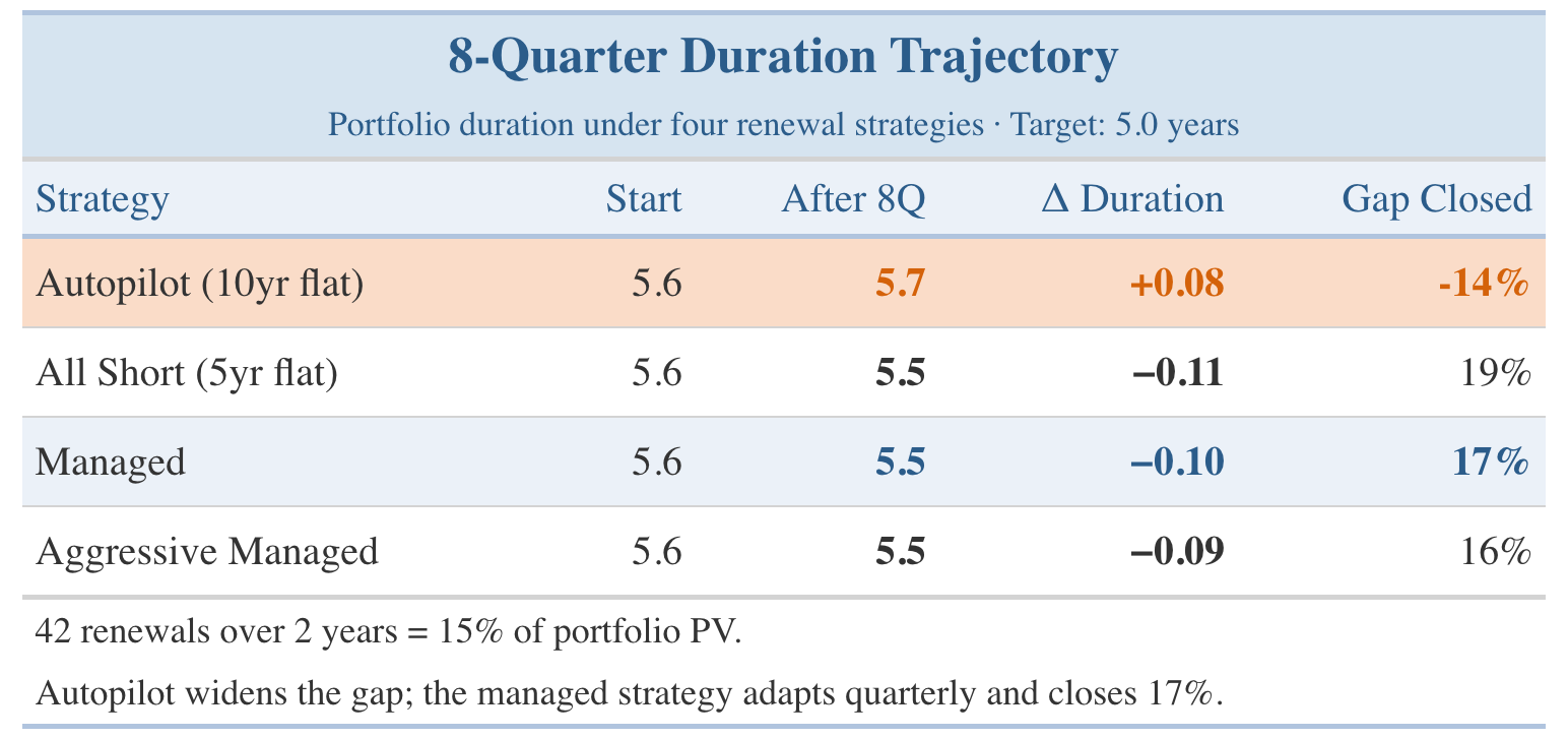 The first row is the one that matters most. If you renew every lease at 10 years without thinking about portfolio composition, duration drifts in the wrong direction. The gap to target doesn’t just fail to close — it widens. Autopilot has a cost, and now it’s measurable.